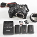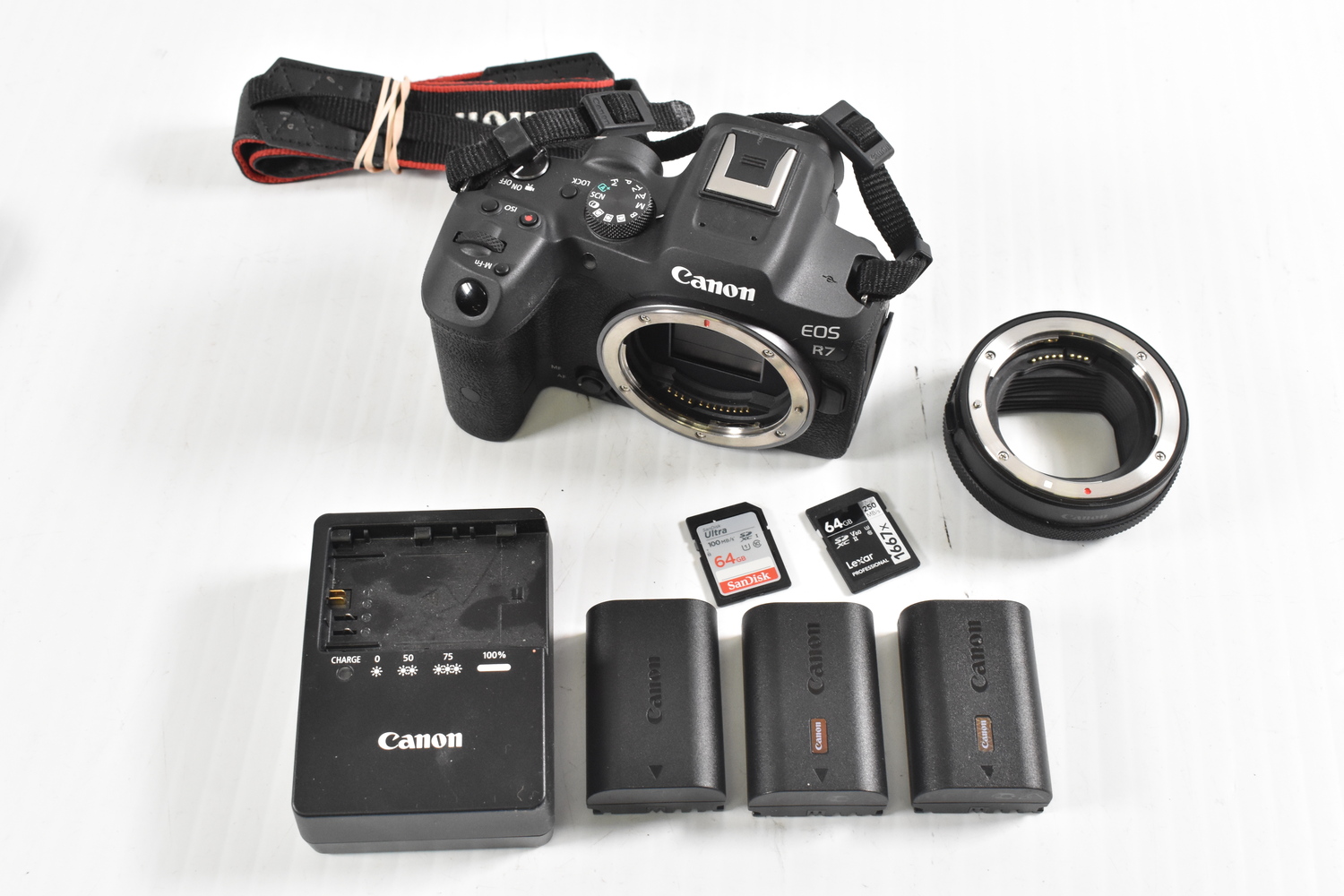 Includes EOS R7 Camera Body, 3X Batteries, Battery Charger, Official Canon EF Mount Adapter, 2x 64GB SD Cards, and camera strap.