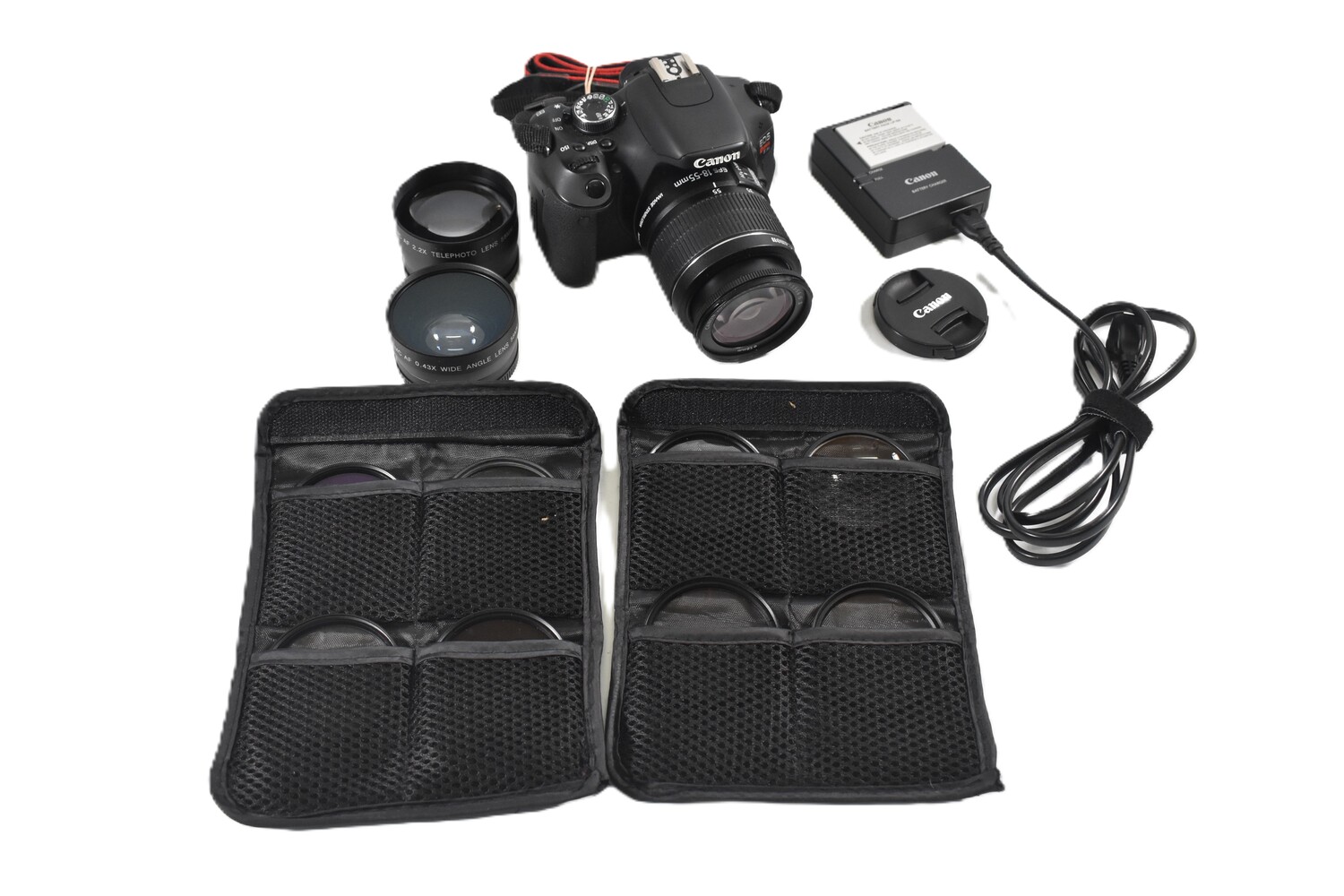 Comes with 18-55mm EFS Lens with Stabilizer, Strap, 2x Batteries, Charger, 2.2x Telephoto lens attachment, 0.43x Wide angle lens attachment, and various filters.