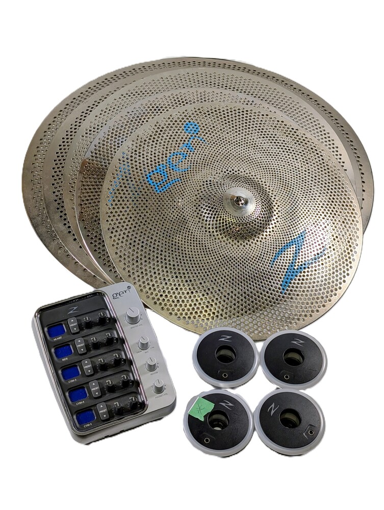Comes with 1x Zildjian Gen16 Controller Unit, 4x pickup adapters (three working great, one has a loose connection with any attached cords and needs to be in a certain position to work properly), 5 cymbals of different sizes, power cord, and connector wires.